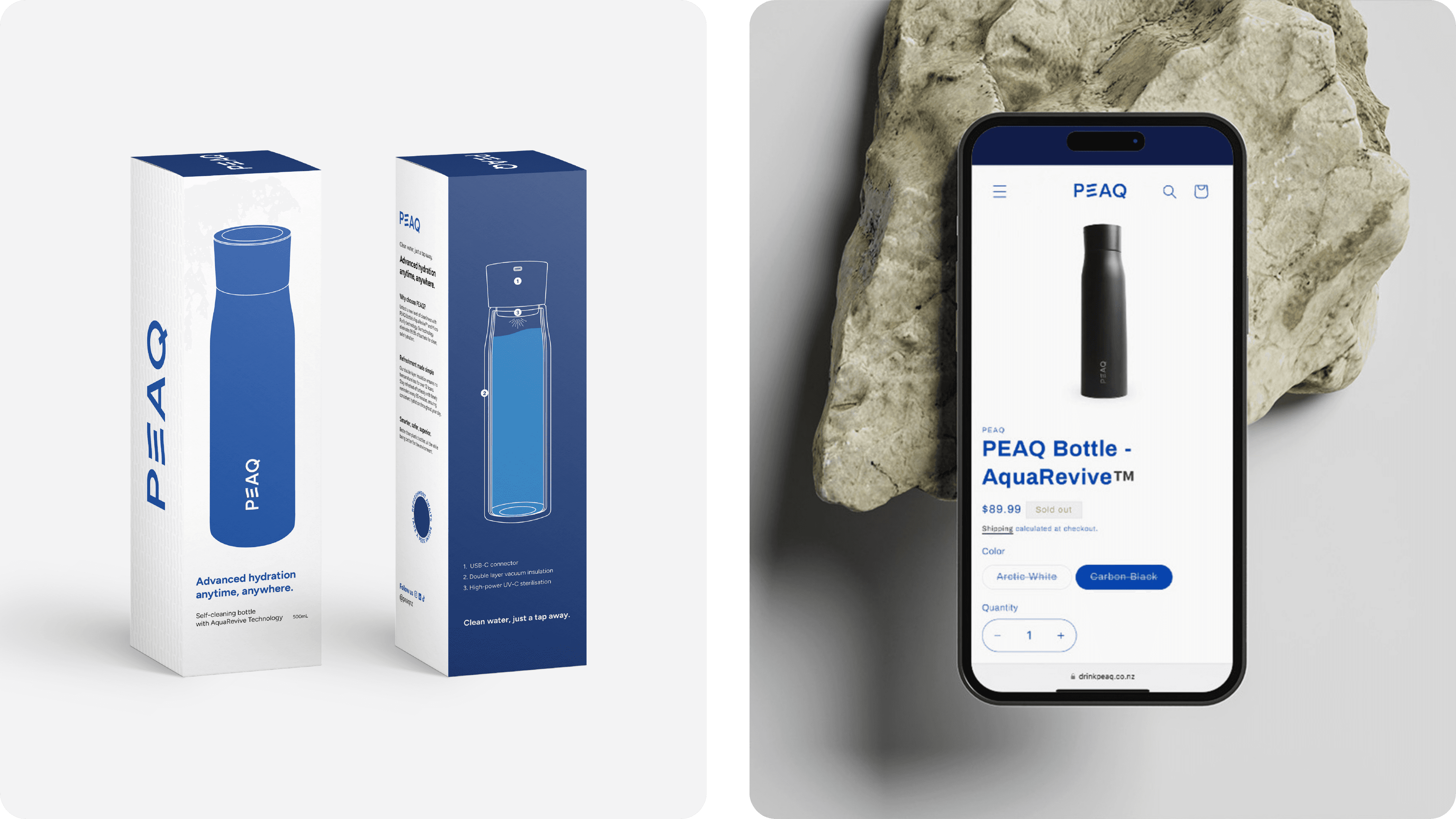 PEAQ pioneers hydration with its AquaRevive™ UV-C technology, drawing inspiration from the serene flow of waves. Its central design identity encapsulates water's dynamic yet calming essence, echoing the brand's commitment to tranquility and strength. With a focus on sustainability and safety, PEAQ sets industry standards, driven by innovation and convenience. Through its carefully curated visual identity, including logo and packaging, PEAQ communicates a relentless pursuit of quality. Positioned at the forefront of the industry, PEAQ leads with modernity and competence, reshaping hydration experiences.